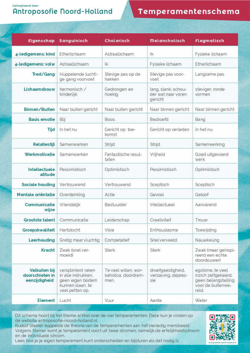 Onderaan het artikel vind je een schema met nog meer kenmerken van de temperamenten, zodat je ze makkelijker met elkaar kunt vergelijken.
