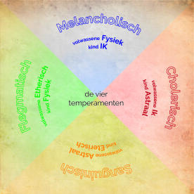 Als het ik van de mens in vroegere aardelevens zo sterk is geworden dat hij de andere drie delen overheerst, spreken we van een cholerisch temperament. Is het astraallichaam overheersend dan ontstaat het sanguinische temperament. Het flegmatische temperament ontstaat bij mensen waarbij het etherlichaam domineert. Is het fysieke lichaam met zijn wetmatigheden zo sterk dat het individuele wezen niet in staat is bepaalde verhardingen van het fysieke lichaam te overwinnen dan ontstaat het melancholische temperament.